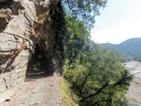 本当に平坦な道を歩き始めるとすぐに天然のトンネルというか洞門というかが現れます。登山道の右手下にはキレイな日置川の流れが見えます。