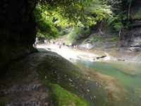 遊歩道は高低差がないものの、全体的に濡れていて滑りやすいです。でも川を見ながら上って行くので快適でした。特に地元の子供が水着姿だったので、私たちも『泳げるかも!』と水着で行ったことも、滑りやすい足元を気にせず進めた一因にあるのですが。遊歩道を5分も進めば滝壺に到着です。