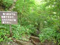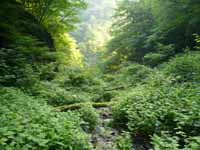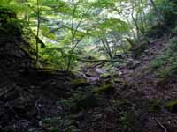 まずは、過去の遊歩道の名残を微かに残す山道を下りますが、序盤から踏み後が乏しく、かなりの冒険気分を味わうことが出来ます。 笹などに覆われた急な斜面を降りると、開けた枯れ沢にでます。この後は枯れ沢に沿ってひたすら下っていきます。 |