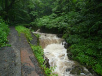 よく整備された遊歩道なのでしょうが、川のように水が流れていて歩きづらかったです。川自体も当然濁流・・・。途中2ヶ所、小さな橋を渡るのですが、流失しないか心配になります。