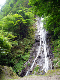 日頃の運動不足がたたって、ゼーゼーいいながら進んでいくと不意に白く糸を引くように水が流れ落ちてくる姿が木々の間から見えてきます。一気にテンションが上がり、全容が見える場所まで早足で進むと『オ〜ッ、なかなかやるな!』といった感じの滝が眼前に現れます。梅雨時にもかかわらず雨不足で心配していましたが、思っていたより立派な滝でしばし見とれてしまいました。他の見学者もいないので、思う存分、満喫して滝をあとにしました。