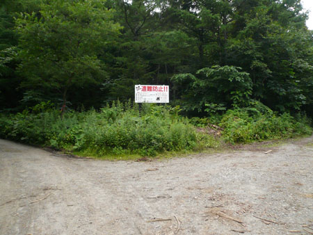 C最後の分岐。ココは左。林道自体が地形図から消える場所。 この先はさらに道が細く、木の枝で車体を擦りまくり・・・。 |