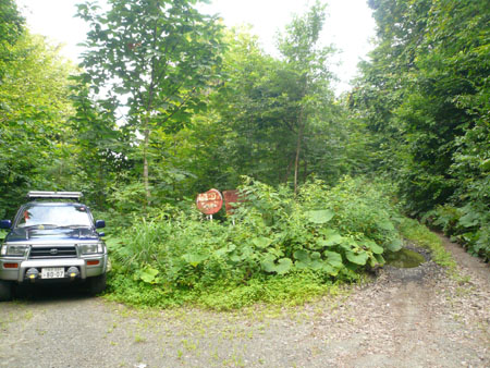 下調べ段階で、分岐が3ヶ所あって、左 → 右 → 左 の順番と頭に入れて向かったのですが、 3つ目の左分岐に向かうまでに、地形図にない分岐がいくつかあり、そのうち2本に迷い込んでしまいました。 迷った道はどれも行き止まりで、本当の原生林の中・・・。 Uターンするのも容易でなかったです。しかも2回目の間違いの時はぬかるみにはまりスタック寸前という状況にもなって、かなり焦りました。 そうした意味からも4WDでないと厳しいです。 木の枝も相当張り出しているので、車を傷付けたくない方にはお勧めしません。3時間歩きましょう。 それにしても山深い場所だった。熊注意とうるさいくらい看板があったので熊ベルと、アブ対策で虫除けも忘れずに! |