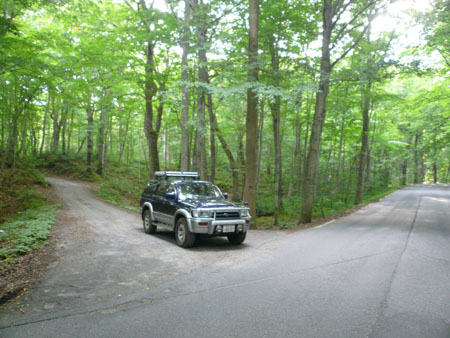 | 黄瀬から林道を約9Kmひたすら歩いて3時間というのが、レギュラーコースの松見の滝ですが、時間短縮のため蔦林道を車で行き、 その林道歩きを1/5程度にしてしまおうというショートカットコースを行きましたので、そのアプローチを記録として残しておきます。 十和田湖から奥入瀬渓流沿いをR103号で下り、奥入瀬渓流ホテルの先の大きな橋を渡って左の蔦温泉方面に行きます(これもR103号)。 クネクネとワインディングを上っていき、間もなく(おそらくあと1Kmくらい)蔦温泉という直角に近い右コーナーを抜けると、 写真@の蔦林道入口があります。これを左折していきます。ちなみに案内標識は一切ありません。 林道はひたすらダートで、ぬかるみあり、砂利あり、深〜いエグレありで、乗用車レベルの車高の車、ましてや2WDでは厳しいです。 この日ほど、『サーフに乗っていて良かった〜』と感じた日はありませんでした。 |