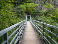 そして5:55写真の吊橋に到着。谷を渡ってくる風が冷たく、山歩きで火照った体をクールダウンしてくれて最高に気持ちよかった!橋の上からは行縢の滝が遠望できます(下の写真ネ)が、凄いな〜と感動する反面、あんな遠くまで歩くのか・・・という弱気なココロも顔をだします。