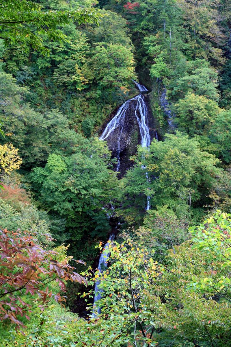 観瀑台からの遠望のみ。紅葉にはやや早く、滝が見えづらい。