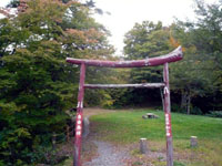 狭い田舎道を走っていくと、左カーブのところが無料駐車場になっています。駐車場から道を渡ると写真の鳥居で、ここが観瀑台というか滝を遠望できる場所になります。どうやら滝を見られるのはこのポイントくらいしかないようです。
