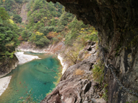七ツ釜滝までの道程の中で一番怖かったのがこの先。と言うか、唯一ここが怖かった。それはシシ淵の高巻。急勾配の鎖場で左はシシ淵に向かってキレ落ちており本当にエメラルドグリーンのシシ淵に吸い込まれそう。