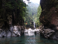 奥にニコニコ滝が見えているので写真を撮りながらおにぎり2個を食べました。 でも、シシ淵はきれいだけど、滝まで遠いので個人的にはあまり興味のわく場所ではなく 三脚を出さず、手持ち撮影。10分強の滞在でそそくさと出発。