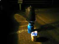 天気は快晴。星が瞬いています。龍双ケ滝まで1Kmくらいの地点に4時40分に到着したので、夜明け(6時頃)を待つ間に朝食にしました。といってもカップ麺ですが。渓流沿いに車を止め、バーナーで湯を沸かし、星を眺めつつシーフードヌードルを食らう。いとおかしデスよ。 |