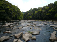 歩き始めると、すぐに広い川原に出る。甌穴がたくさんあるのですぐに滝の上流部にいることが分った。下調べの段階で上流部に大量の甌穴があることことが分っていたのでネ。 凄いな〜と思いながら対岸に渡り、神社を抜け階段を下りていくと、およそ5分で観瀑台に到着。 |