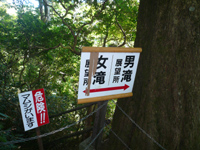 観瀑台へは階段で約110段の下りです。勾配はややきつめでしょうか。途中、女滝への分岐がありますが、『マムシ注意』の看板とチェーンで通行止め。すなわち女滝は吊橋からしか見られません。 |