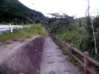 左の写真が駐車場から観瀑台への遊歩道です。左に国道57号を見ながら緩い勾配の道を行きます。まずは下り、そして上り、最後はやや勾配のきつくなった下り階段ですが、距離がないのでラクラクです。駐車場から3分くらいでしょうか。途中ヘビがいたりで驚きましたが、難なく観瀑台へ到着です。ただ今の時刻は朝5時45分です。当然、他の人は誰もいませんでした。